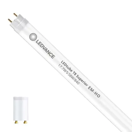 Bei der Ledvance LED Röhre T8 Superior (EM/Mains) High Output 17.7W 3100lm - 840 | 150cm - Ersatz Für 58W handelt es sich um eine energieeffiziente LED-Röhre. Sie ersetzt Ihre konventionelle Leuchtstoffröhre mit 58W. Die Röhre ist 1513 mm lang und hat die Farbtemperatur 4000K - Kaltweiss. Die durchschnittliche Lebensdauer der LED-Röhre beläuft sich auf 75000 Stunden. Wir bieten Ihnen für dieses Produkt eine Garantie von 5 Jahre an.