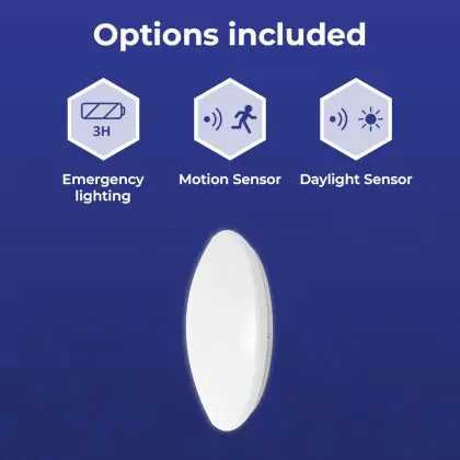 Description Hublot LED V2 Blanc 12/16/20W 2000lm 830-840-865 CCT | IP44 - Détecteur de Mouvement et de Lumière - Détresse 3H